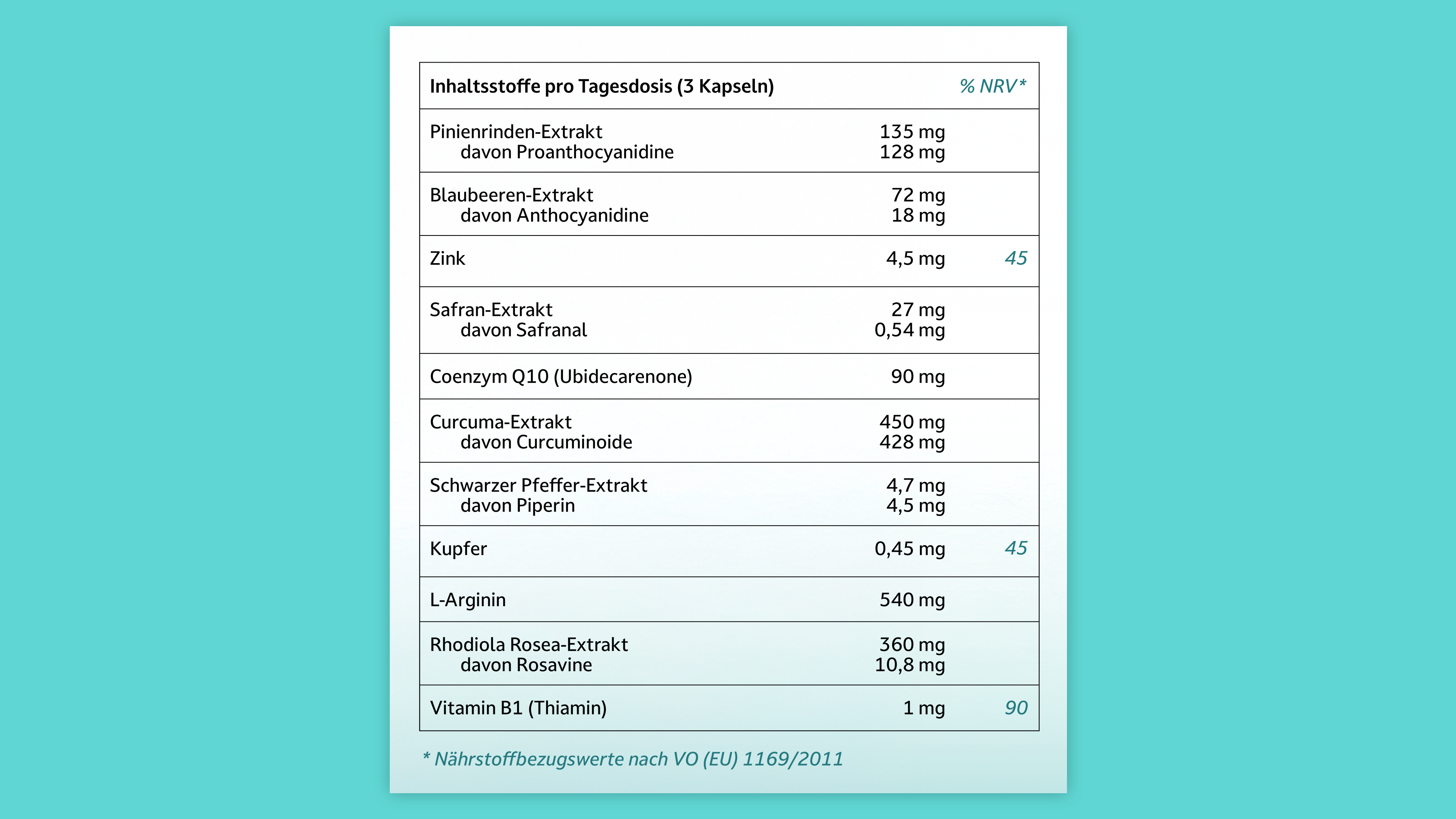 Inhaltsstoffe pro Tagesdosis (3 Kapseln) – Menge – % NRV* » Pinienrinden-Extrakt – 135 mg »» davon Proanthocyanidine – 128 mg » Blaubeeren-Extrakt – 72 mg »» davon Anthocyanidine – 18 mg » Zink – 4,5 mg – 45 % » Safran-Extrakt – 27 mg »» davon Safranal – 0,54 mg » Coenzym Q10 (Ubidecarenone) – 90 mg » Curcuma-Extrakt – 450 mg »» davon Curcuminoide – 428 mg » Schwarzer Pfeffer-Extrakt – 4,7 mg »» davon Piperin – 4,5 mg » Kupfer – 0,45 mg – 45 % » L-Arginin – 540 mg » Rhodiola Rosea-Extrakt – 360 mg »» davon Rosavine – 10,8 mg » Vitamin B1 (Thiamin) – 1 mg – 100 % * Nährstoffbezugswerte nach VO (EU) 1169/2011