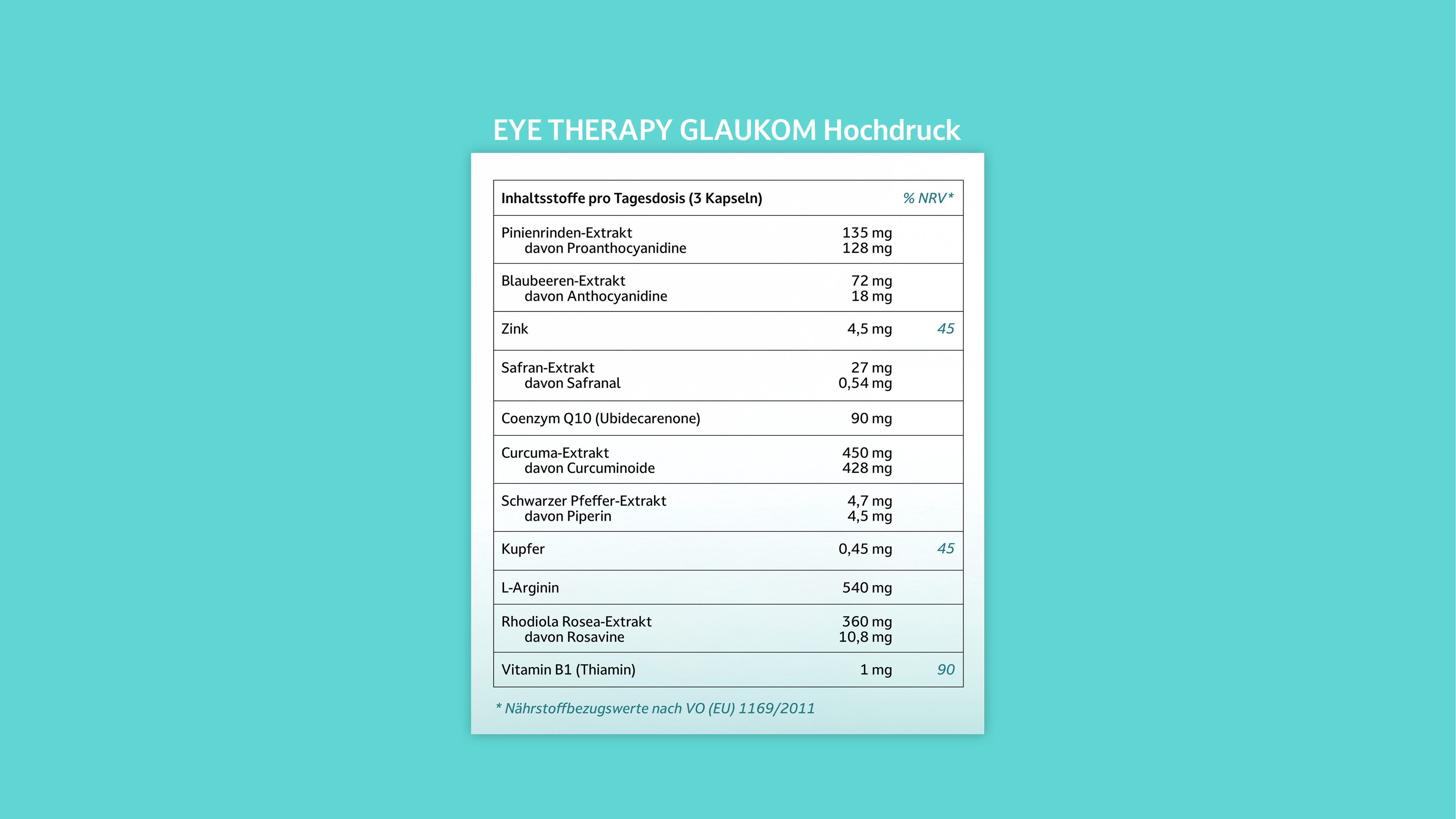 1. EYE THERAPY GLAUKOM Hochdruck Inhaltsstoffe pro Tagesdosis (3 Kapseln) – Menge – % NRV* » Pinienrinden-Extrakt – 135 mg »» davon Proanthocyanidine – 128 mg » Blaubeeren-Extrakt – 72 mg »» davon Anthocyanidine – 18 mg » Zink – 4,5 mg – 45 % » Safran-Extrakt – 27 mg »» davon Safranal – 0,54 mg » Coenzym Q10 (Ubidecarenone) – 90 mg » Curcuma-Extrakt – 450 mg »» davon Curcuminoide – 428 mg » Schwarzer Pfeffer-Extrakt – 4,7 mg »» davon Piperin – 4,5 mg » Kupfer – 0,45 mg – 45 % » L-Arginin – 540 mg » Rhodiola Rosea-Extrakt – 360 mg »» davon Rosavine – 10,8 mg » Vitamin B1 (Thiamin) – 1 mg – 100 % 2. EYE THERAPY GENERAL Inhaltsstoffe pro Tagesdosis (3 Kapseln) – Menge – % NRV* » Tagetes erecta-Extrakt – 100 mg »» davon Lutein – 5,0 mg »» davon Zeaxanthin – 0,4 mg » Blaubeeren-Extrakt – 40 mg »» davon Anthocyanidine – 10 mg » α-Liponsäure – 50 mg » Calcium – 260 mg – 32,5 % » Chrom – 20 μg – 50 % » Folsäure – 100 μg – 50 % » Ginkgo biloba-Extrakt – 50 mg »» davon Flavonoide – 12 mg » Hesperidin – 75 mg » Kupfer – 0,5 mg – 50 % » L-Cystein – 50 mg » L-Histidin – 50 mg » L-Lysin – 50 mg » L-Glutamin – 40 mg » Glycin – 40 mg » L-Glutathion – 75 mg » Quercetin – 50 mg » Rutin – 50 mg » Selen – 27,5 μg – 50 % » Taurin – 100 mg » Traubenkern-Extrakt – 100 mg »» davon OPC – 95 mg » Magnesium – 75 mg – 20 % » Thiamin – 0,55 mg – 50 % » Riboflavin – 0,7 mg – 50 % » Niacin – 8,0 mg – 50 % » Vitamin B6 – 0,7 mg – 50 % » Vitamin B12 – 1,25 μg – 50 % » Vitamin A – 400 μg – 50 % » Vitamin C – 80 mg – 100 % » Vitamin E – 12 mg – 100 % » Weihrauch-Extrakt – 50 mg »» davon Boswelliasäuren – 33 mg » Zink – 5,0 mg – 50 % * Nährstoffbezugswerte nach VO (EU) 1169/2011